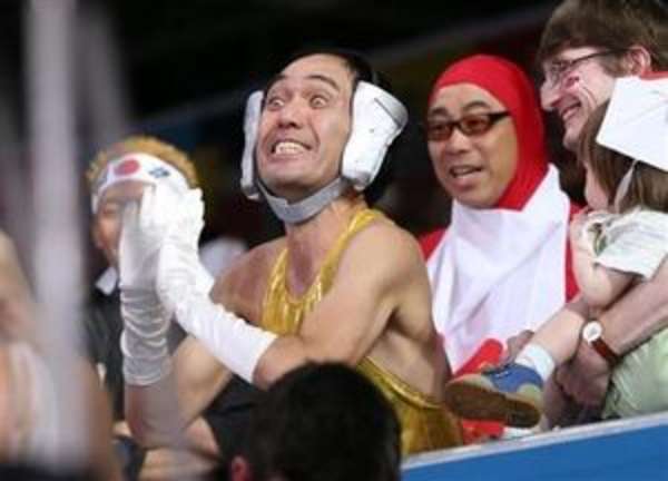 レスリングの会場には、吉田沙保里選手がリオオリンピックで金メダルを獲得すると信じている。日本の応援団の姿があった。